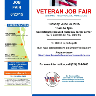 Attention Veterans: Veteran Job Fair Location: CareerSource Brevard (Palm Bay, Florida location)   Veterans – Reserve/Guard – Transitioning Active Duty Military – Military Family Members Date: June 23, 2015 Time: 10 am -to- 1 pm  Where: At the CareerSource Brevard in Palm Bay Florida 5275 Babcock St., NE, Suite 8B This is an exclusive event to help businesses seek talented… Read more